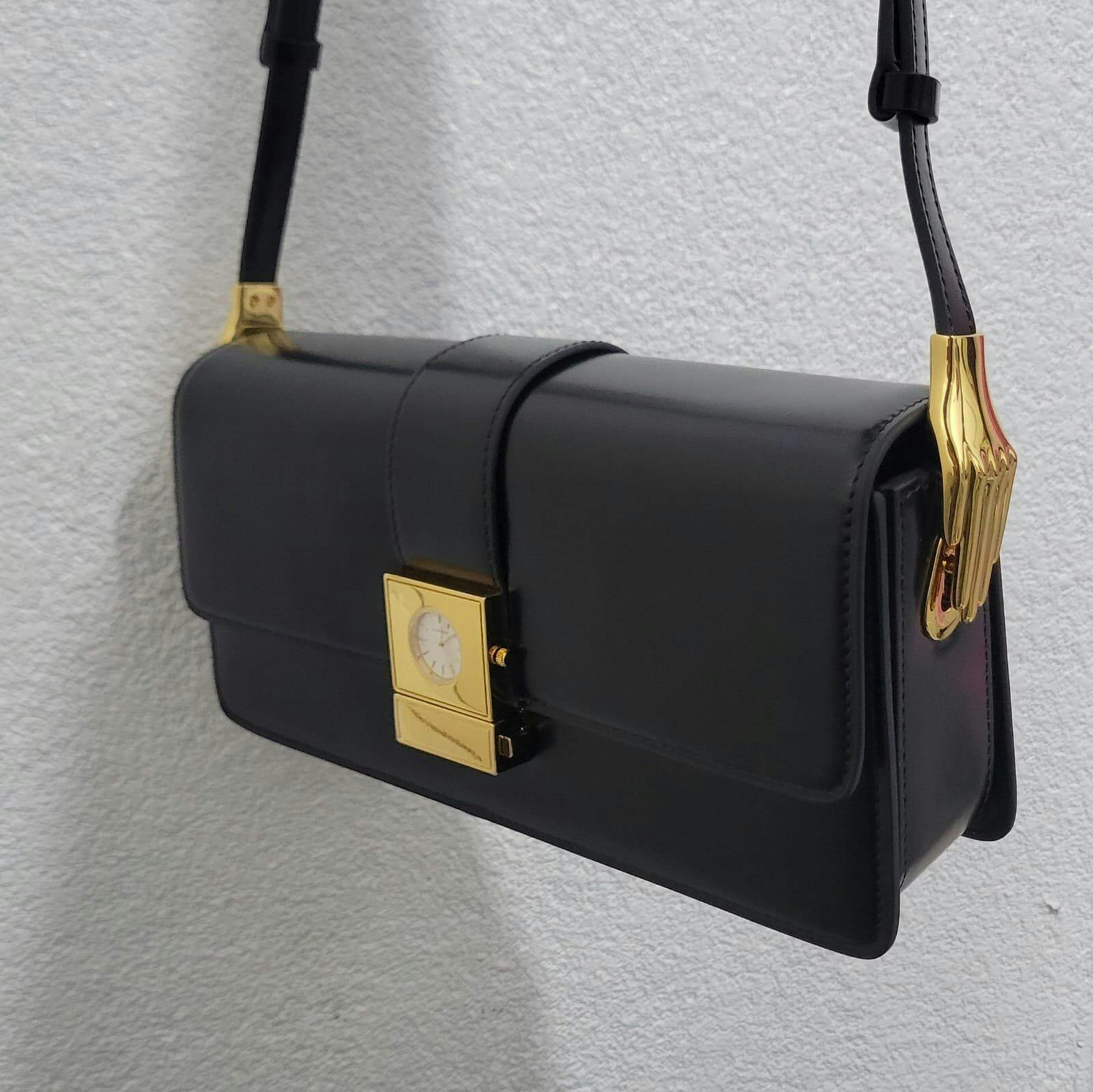 תיק כתף באגט, עור תבואה שחור, רצועת כתף מתכווננת, אבזם שעון זהב טון.